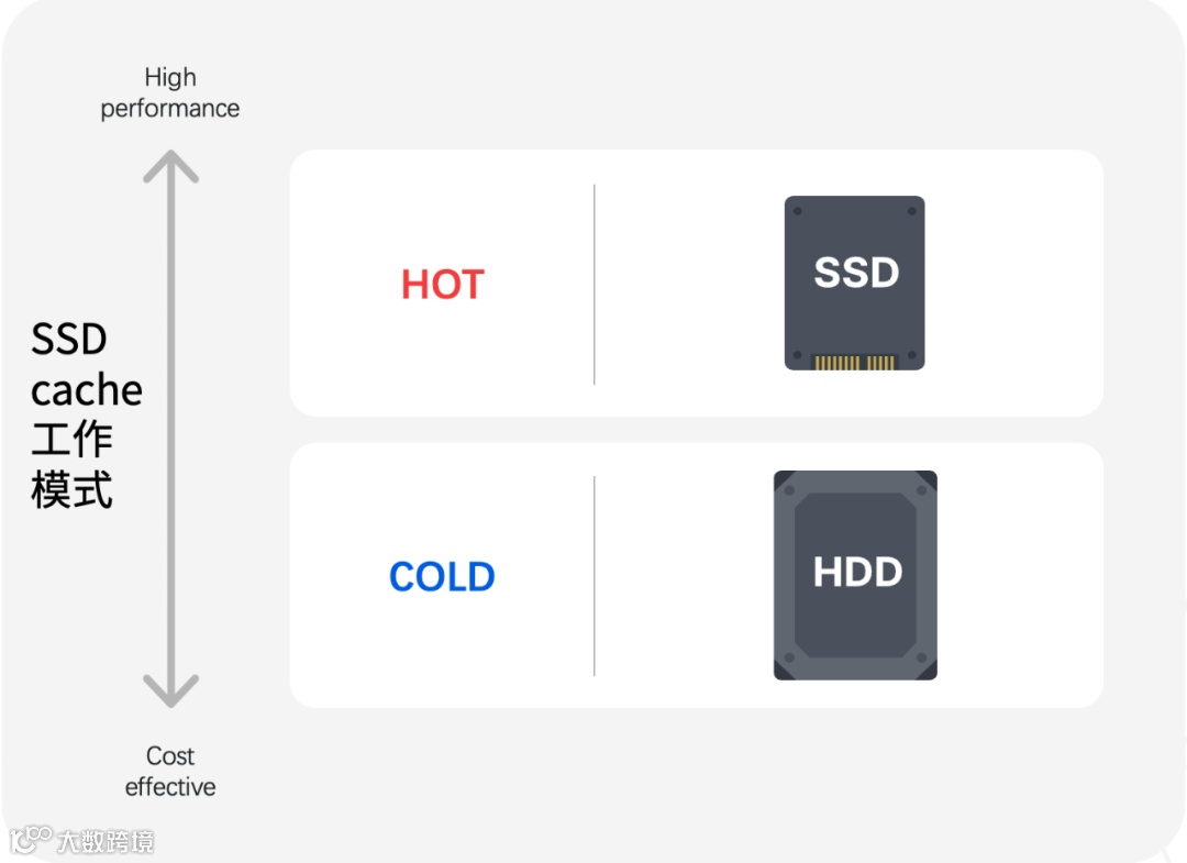 很多企业在未使用数据分层模式前,会通过建立 SSD 缓存来提升系统性能效率,SSD 缓存可将经常访问的热数据缓存到 SSD 中,分为只读缓存和读写缓存,随着访问数据增长,会逐渐占满 SSD 缓存空间,此时就会将时间久、访问频率低的数据进行清空,而其热/冷数据的判断是基于块级数据访问的频率。