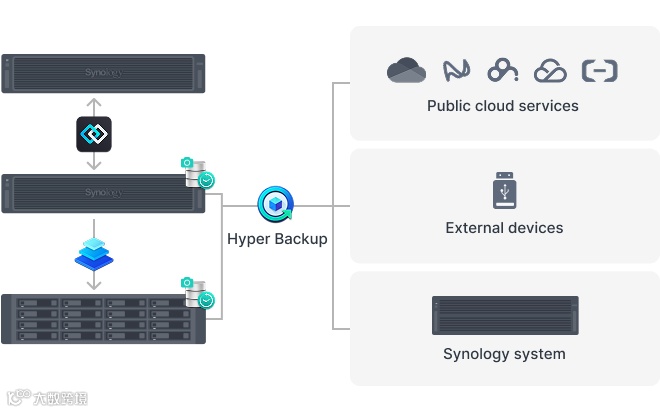 更重要的是,还能直接和 Snapshot Replication 快照复制、Hyper Backup 多目的地备份、Synology High Availability 双机热备集成,提升关键业务的数据安全性,并可将重要的数据备份至远程设备或云端,避免因勒索病毒、硬件损耗、人为恶意操作等因素而产生经济损失。