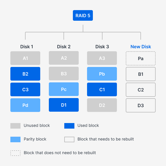如下图,通过快速修复能得知当前文件系统中未使用的数据区块 (A1、A2、A3、B3、D2),此时会判断若该数据区段涵盖的所有数据区块皆未使用(A1、A2、A3),便会略过在新硬盘上 Pa 区块的重建;反之,若该数据区段的数据区块同时包含已使用 (B2) 和未使用 (B3) 的数据区块,则会执行 B1 区块的重建。当然,为了确保数据完整性,未被重新计算与重建的数据区块,在快速修复之后仍会再执行 Data Scrubbing,检查和自动修正数据以防止潜在的数据毁损。