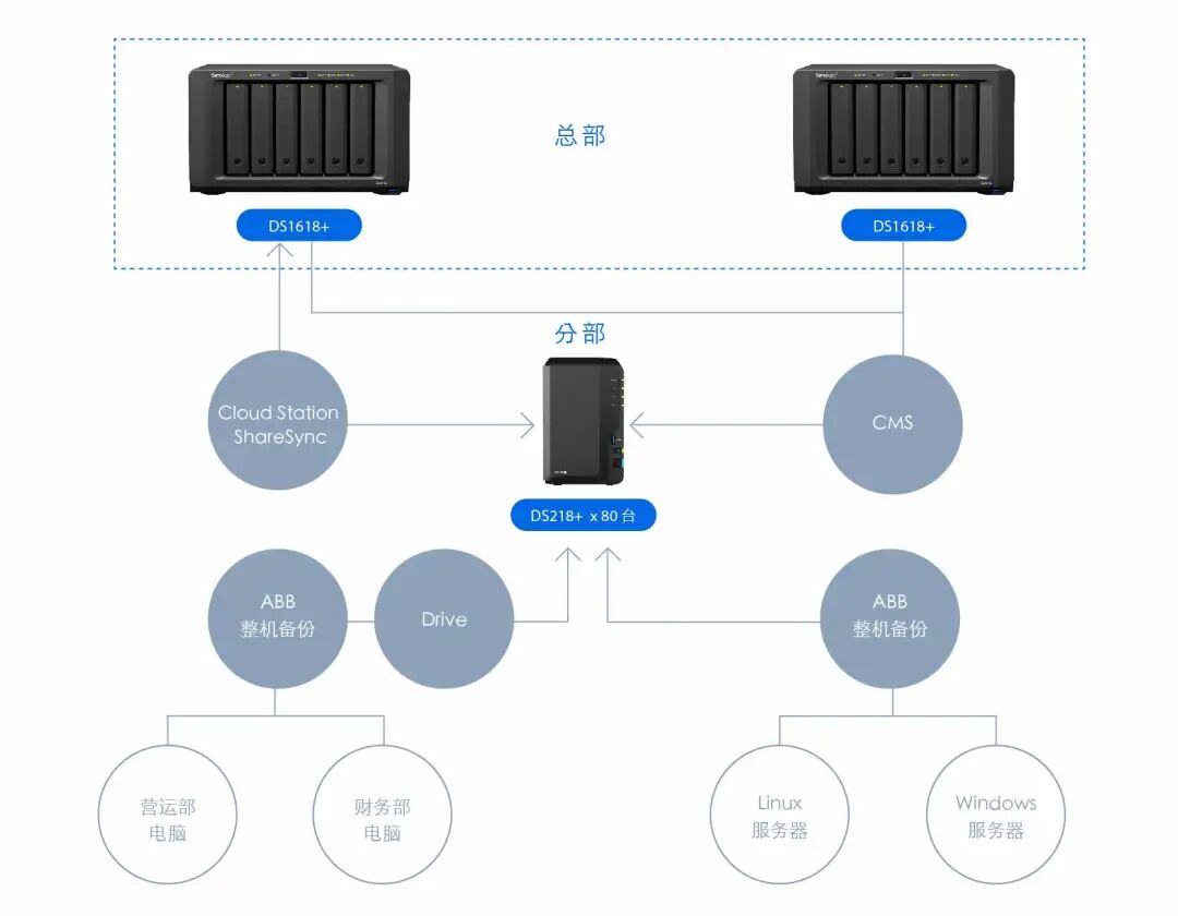京客隆作为大型连锁超市,总部在北京,共有 200 多家分店,在总部部署 2 台群晖 DS1618+,在各分店部署了 80 台 DS218+。各分店 DS218 + 自动备份本地 Linux 服务器与 Windows 办公电脑数据,再通过多站点同步功能将文件统一归档至总部 DS1618+。总部 IT 人员借助群晖 CMS 套件,可远程统一配置、监控所有分部 NAS 设备,实现多站点数据的集中化、可视化管理。