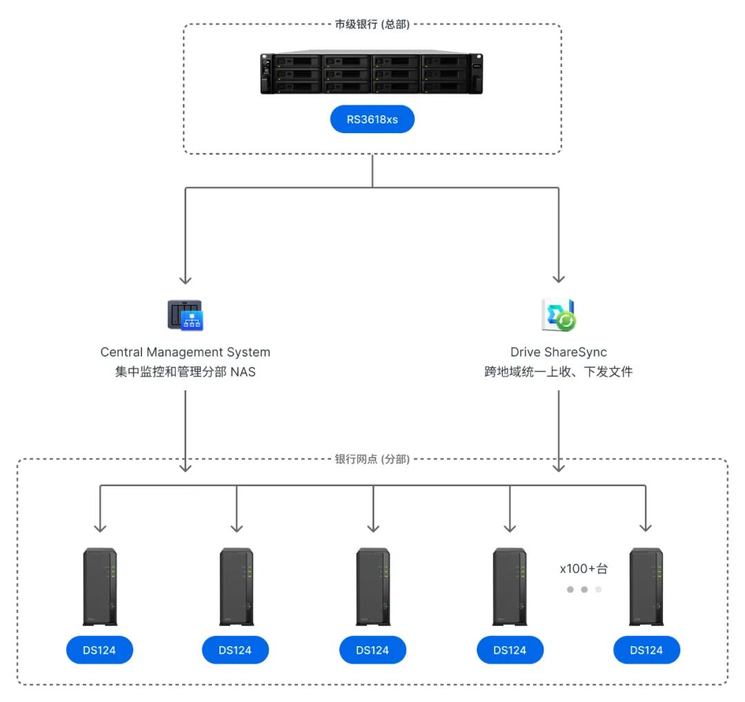 潍坊农商银行在总部架设了一台 RS3618xs,担任文件管理与下发的核心枢纽,各银行网点部署 1 台 DS124,形成一张覆盖各网点的存储网络。借助自定义自动清理脚本,在所有网点 NAS 上实现非必需数据的自动化、无遗漏定期删除,既保障了跨区域文件同步效率,又完全满足金融行业安全合规要求。