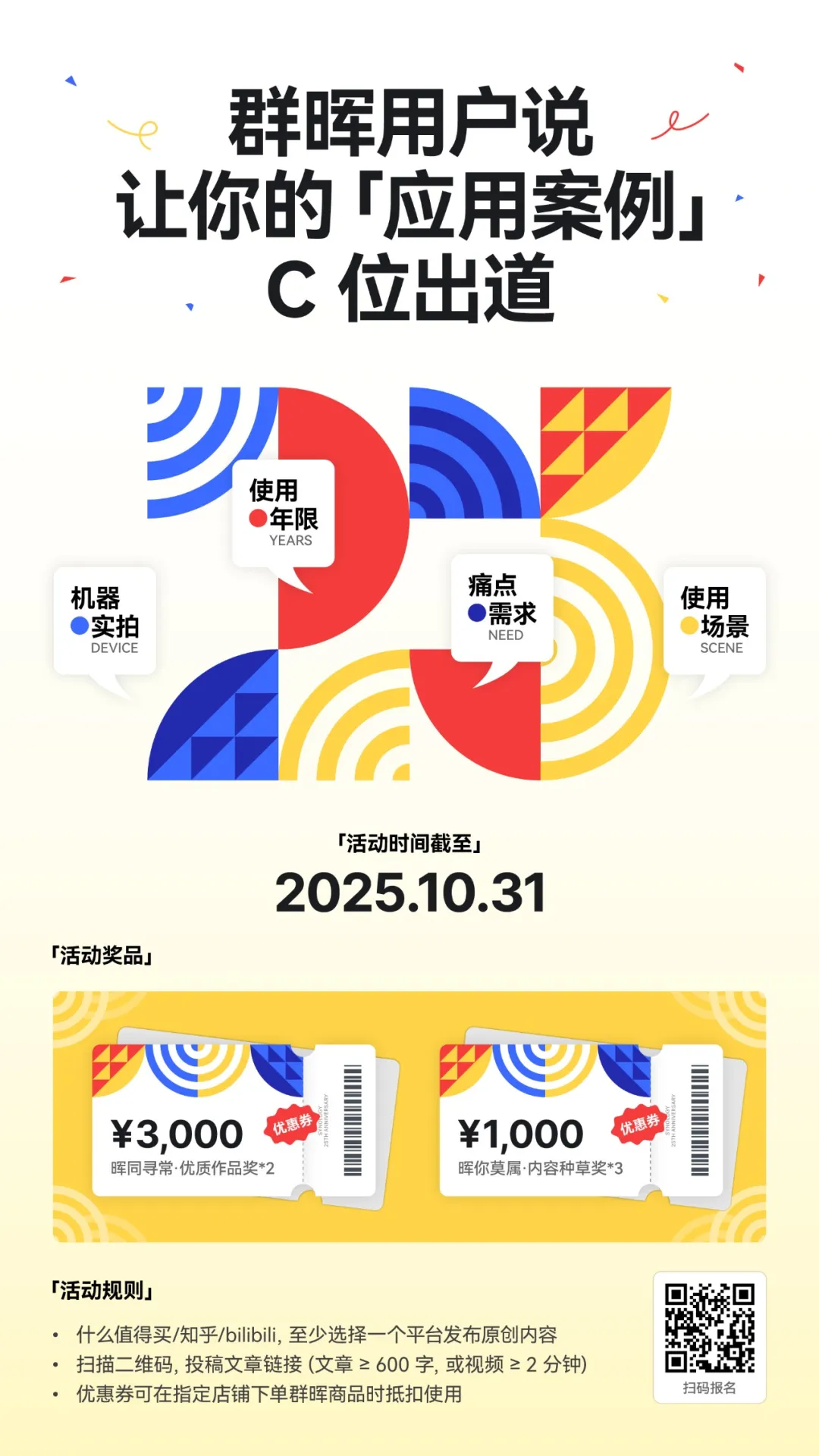 期待各位精彩的故事,让更多的人看到你们的分享,让群晖和你们一起成长,赶快点击“阅读原文”或扫描海报二维码进行投稿!