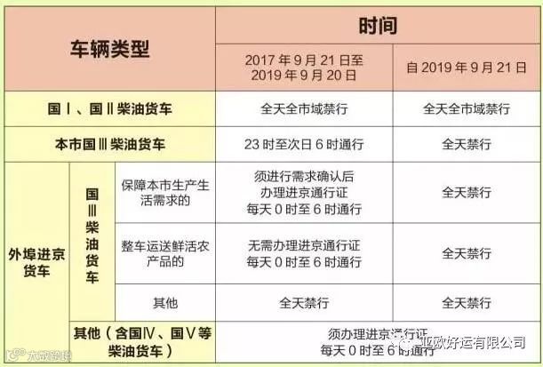 外埠国Ⅲ柴油货车由阶段性通行调整为六环内全天禁行;外埠国Ⅳ及以上排放标准货车仅允许在0至6时进入六环内,并须办理进京证[k]。整车运输鲜活农产品车辆进京证办理流程已简化[k]。本地国Ⅲ柴油货车目前执行五环内6至23时限行,未来将逐步升级为六环内全天禁行[k]。