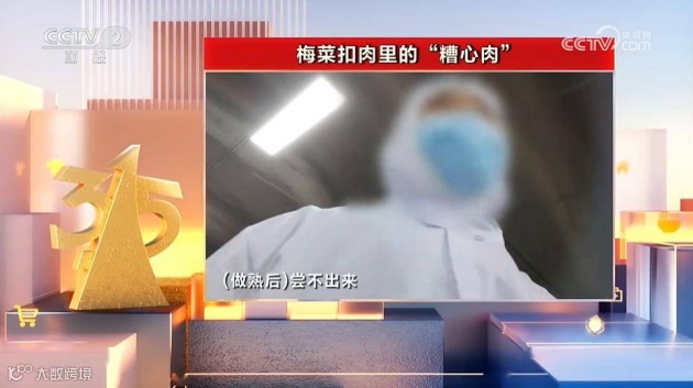 今年315晚会同样爆出了令人发指的“梅菜槽头肉”事件——市场上热卖的梅菜扣肉原料竟是劣质槽头肉,淋巴、腺体肉眼可见。在梅菜扣肉预制菜的主要产区之一安徽省阜阳市,当地人称这早已是公开的秘密。