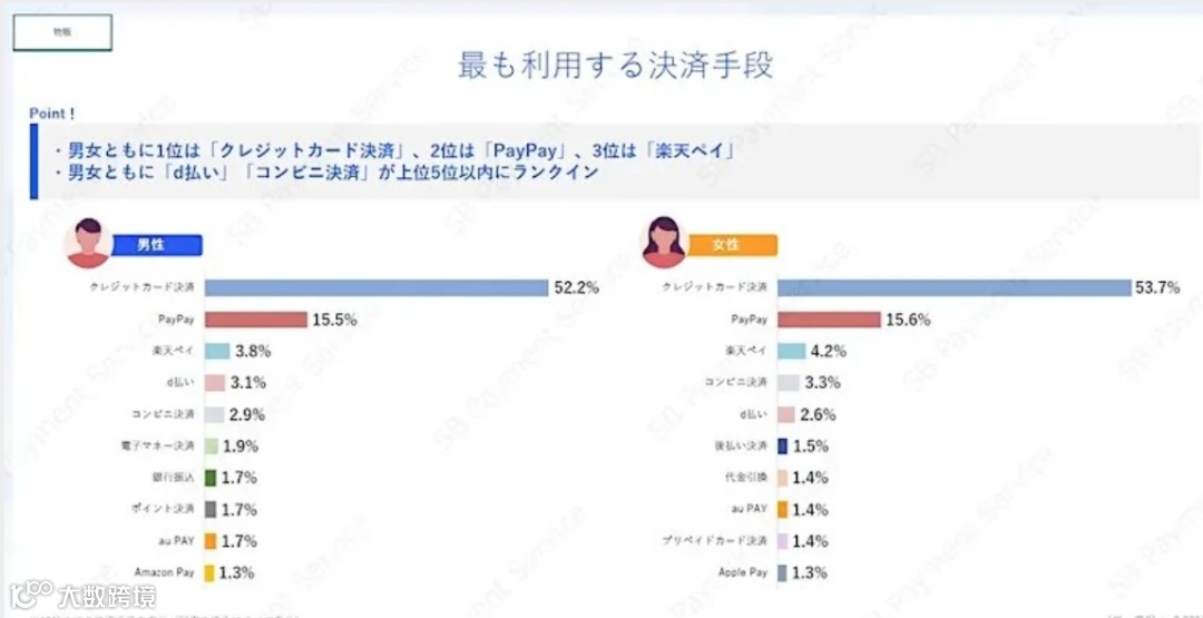男女用户首选支付方式均为信用卡,其次为PayPay和Rakuten Pay[k]。