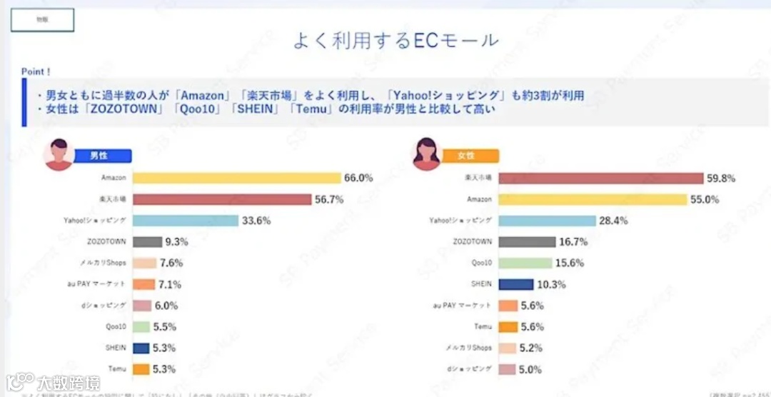 男性最常使用的电商平台为亚马逊(66.0%)、乐天市场(56.7%)和雅虎购物(33.6%);女性则首选乐天市场(59.8%)、亚马逊(55.0%)和雅虎购物(28.4%)[k]。