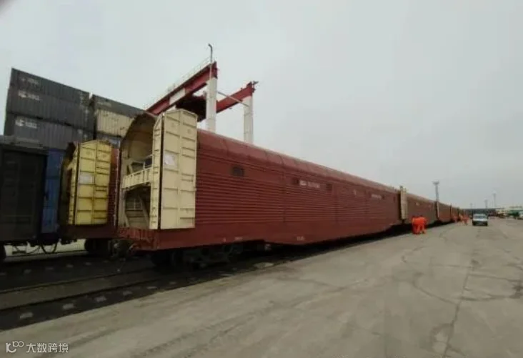 小汽车通过铁路运输,以笼车装载并进行多层堆叠和加固,最终运抵目的地[k]。