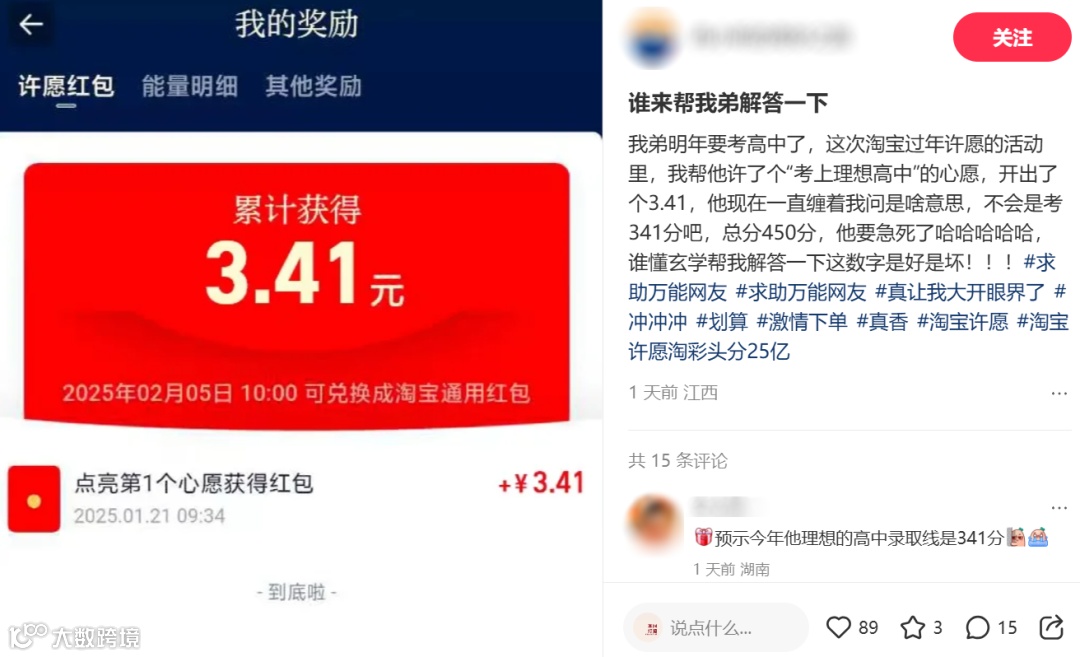 有人为明年考高中的弟弟许愿,结果对于淘宝发红包拆出3.41这个数字,都要玄学拆解下寓意。网友在线脑洞大开:寒窗3年,奋斗4季,1定成功,还有嘴毒的网友评:复读3次谈了4次恋爱然后1次也没考上。(网友的弟弟哭晕)