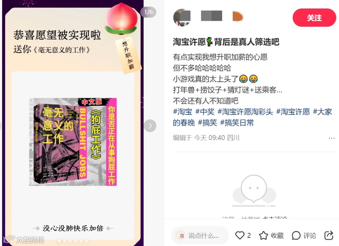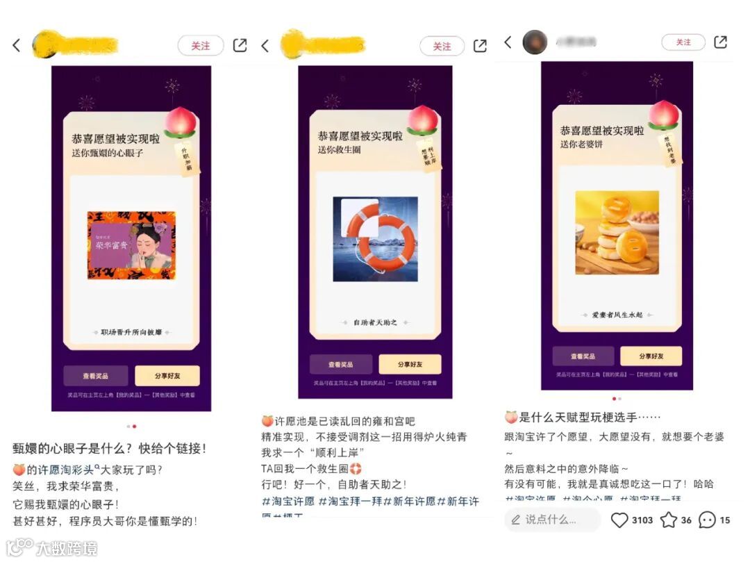 今年过年不忙着拜年,忙着去淘宝许愿了。好消息是不少网友的赛博许愿中奖了!坏消息是礼物多少有点离离原上谱!想上岸有救生圈;想升职加薪有甄嬛的心眼子;想要对象有老婆饼……淘宝这是后台人工筛选了心愿,再派单给神仙助力的吧?