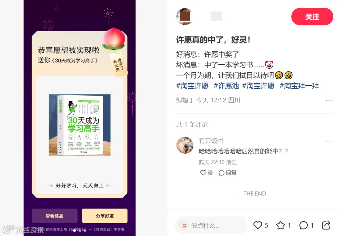 网友太想进步的愿望可能魁星没听见,淘宝反手送了本《30天成为学习高手》,好消息是网友的愿望中奖了,坏消息是,得一个月检查成果。