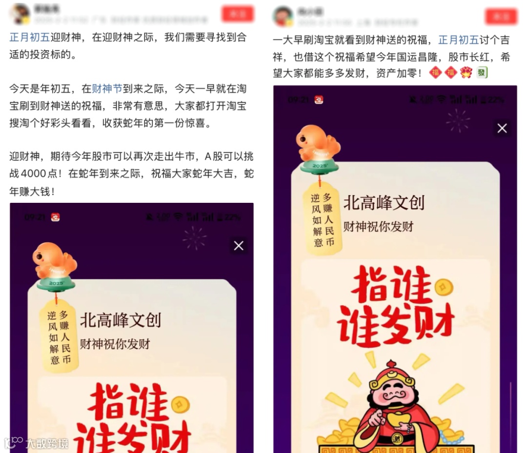 看来无论多么垂直细分领域的心愿,淘宝都能给网友找到相应的“神助力”,祝网友所愿皆所得。更有意思的是,初五迎财神,淘宝又又又整活,专门放送财神彩蛋,邀请北高峰财神助力更多人新年财运旺起来。初五上淘宝许愿能得到来自财神爷的亲口祝福,甚至成为“财神锦鲤”后,还会由“五路财神”为其在北高峰天下第一财神庙内挂上求财许愿条,这待遇也是没谁了。以前鞭炮迎财神,今年上淘宝接财神。