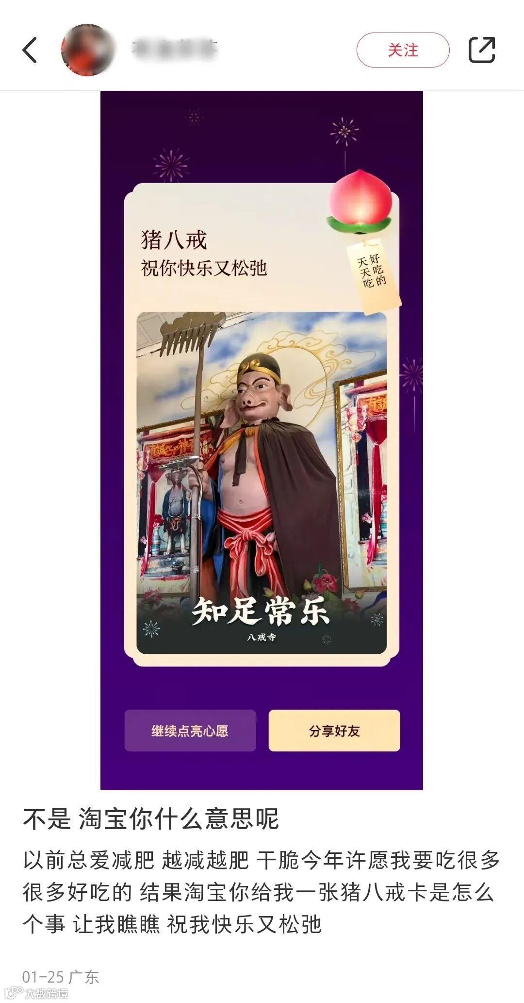还有网友许愿希望自己天天吃好吃的,晒出收到了天蓬元帅的祝福“八戒祝你快乐又松弛”,咱就是说,这个愿望的确是属于精准对接了。
