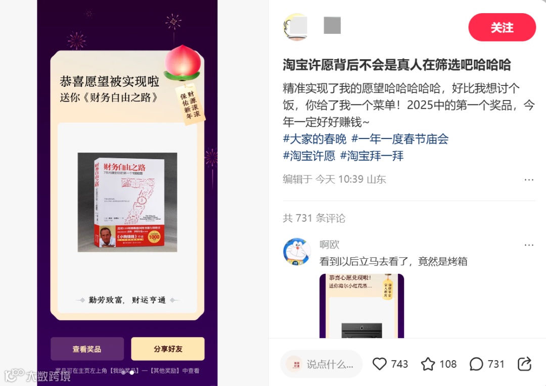 有网友许愿保佑新年财源滚滚,这回财神不当值,淘宝给你扔了本《财务自由之路》。这波愿望的精准对接,让网友一个黑人问号脸:好比我想讨个饭,你给了我一个菜单。