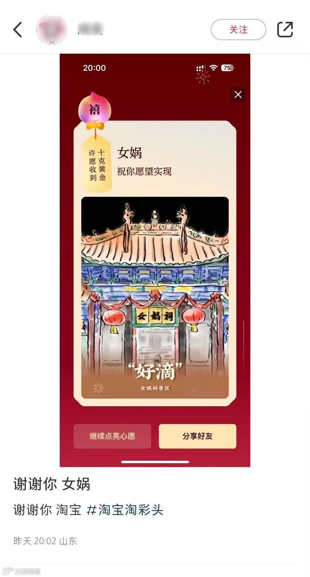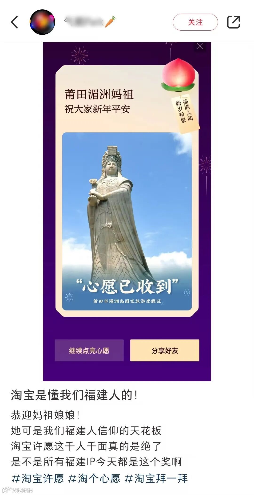 淘宝心愿助力真的是千人千面,这次居然还把“福建顶流”妈祖请出山了,真的是把福建人的心拿捏得死死的。