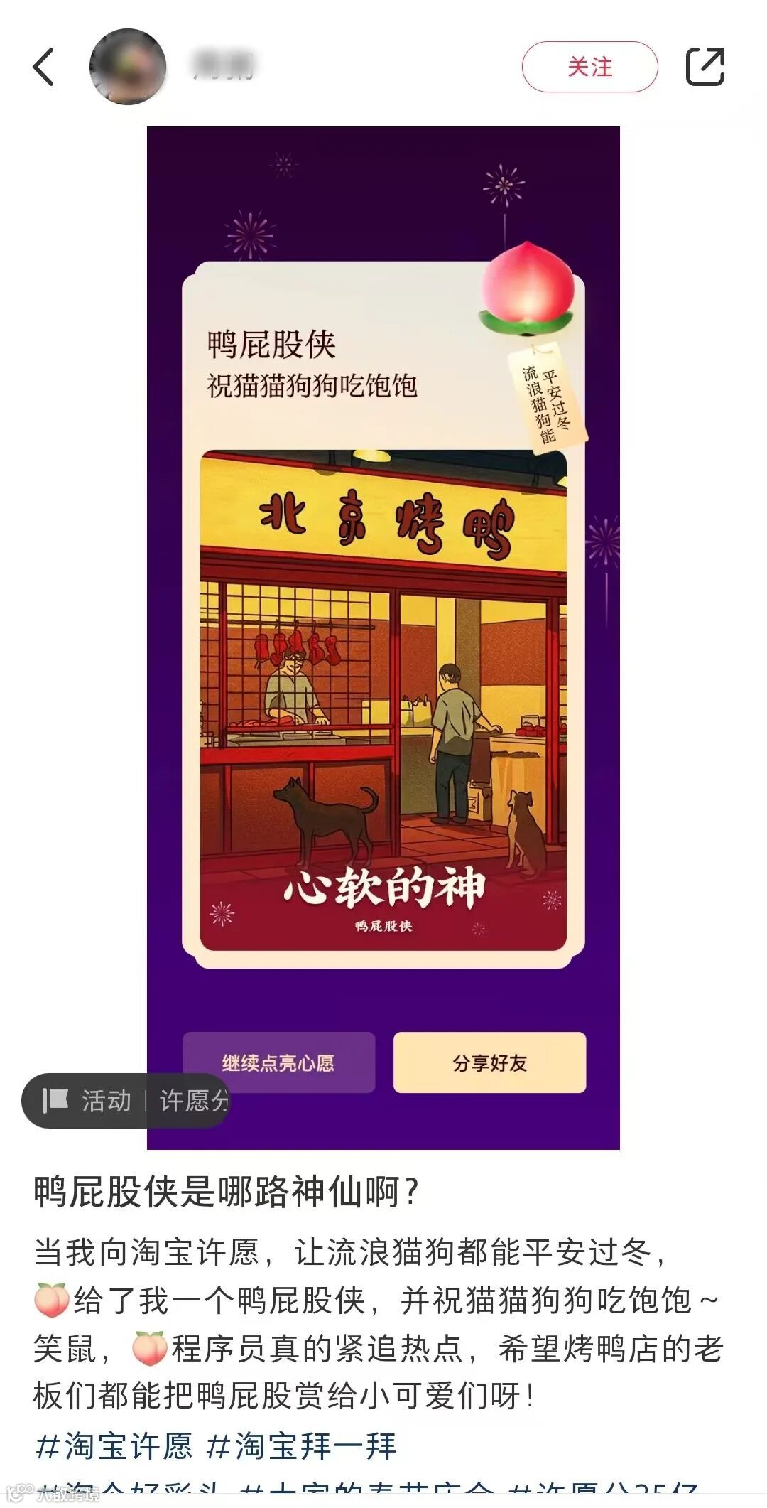 除了正规在编的神仙,淘宝还联系了各路奇奇怪怪的“大神”来助力。有网友希望流浪的小动物平安过冬,烤鸭店的“鸭屁股侠”出场,祝猫猫狗狗吃饱饱。