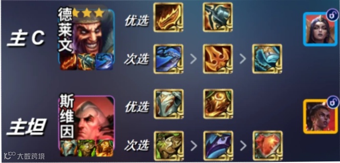 3.主C/主坦装备搭配:主C德莱文优先选择无尽、饮血,次选正义、破甲;主坦斯维因优选狂徒、龙牙,其次是反甲、石像鬼