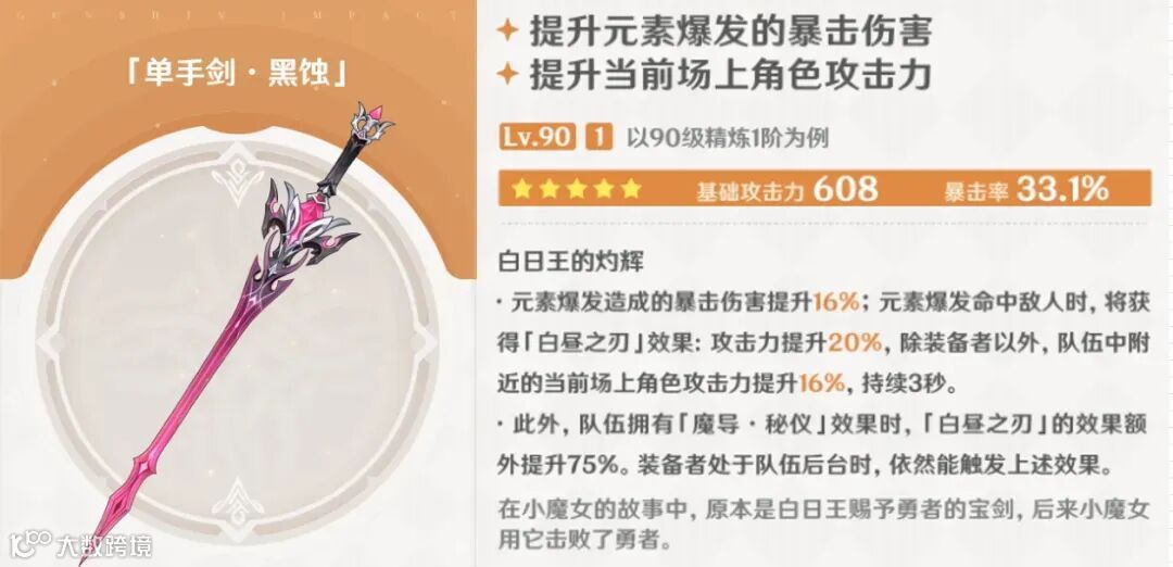 提供高攻击力和较高的暴伤,队内有两位魔导角色时,武器可以快速叠加增伤,最高获得60%增伤。完美契合新风C温迪。
