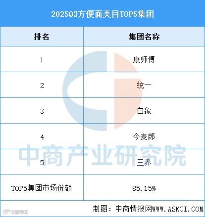 2025Q3,方便面类目的前五集团由康师傅、统一、白象、今麦郎和三养组成,市场份额合计85.15%,市场集中度高且相比上个季度有所提升。