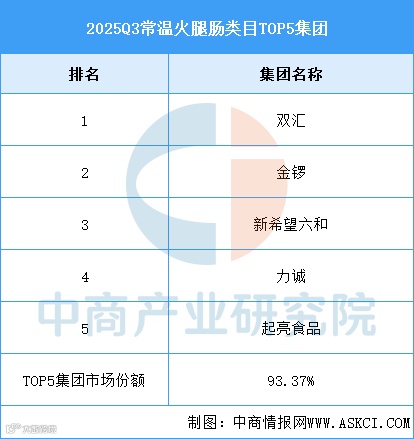 2025Q3,低温香肠类目TOP5集团分别为双汇、金锣、雨润、飘香和得利斯,市场份额合计71.53%,集中度较高但较上个季度有环比轻微下降。