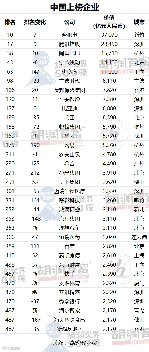 2023胡润世界500强发布,顺丰落榜,拼多多新进百强