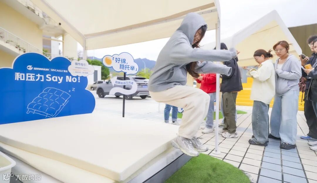 “好眠,瞬透气”材料区,成为好奇心的聚集地,同学们亲手感受不同密度记忆绵的特性——慢回弹的温柔包裹,高弹材质的灵动支撑。每一种触感背后,都是万华化学在前端提供的尖端环保材料与SINOMAX赛诺人体工学技术的精准呼应。