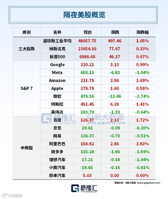 大型科技股多数上涨,特斯拉、亚马逊、博通涨超1%,Meta跌超1%,微软跌超2%。纳斯达克中国金龙指数收涨0.65%,热门中概股中,贝壳涨超3%,阿里巴巴、百度涨超1%,拼多多、理想汽车跌超1%,京东跌0.3%。