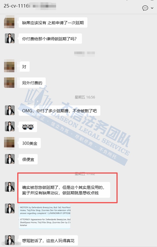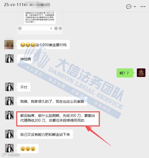 更严重的是,当客户要求终止代理时,对方竟以已完成“延期”为由,强行索要200美元“代理费”才肯退出。此类行为已完全背离法律服务本质。