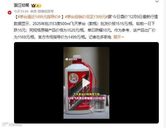 今日酒价平台数据显示,2025年飞天茅台原箱价为1520元,散瓶价1515元。电商平台中,双十一期间刚跌破1499元的53度飞天茅台,目前已出现1399元报价,部分商家价格更低。