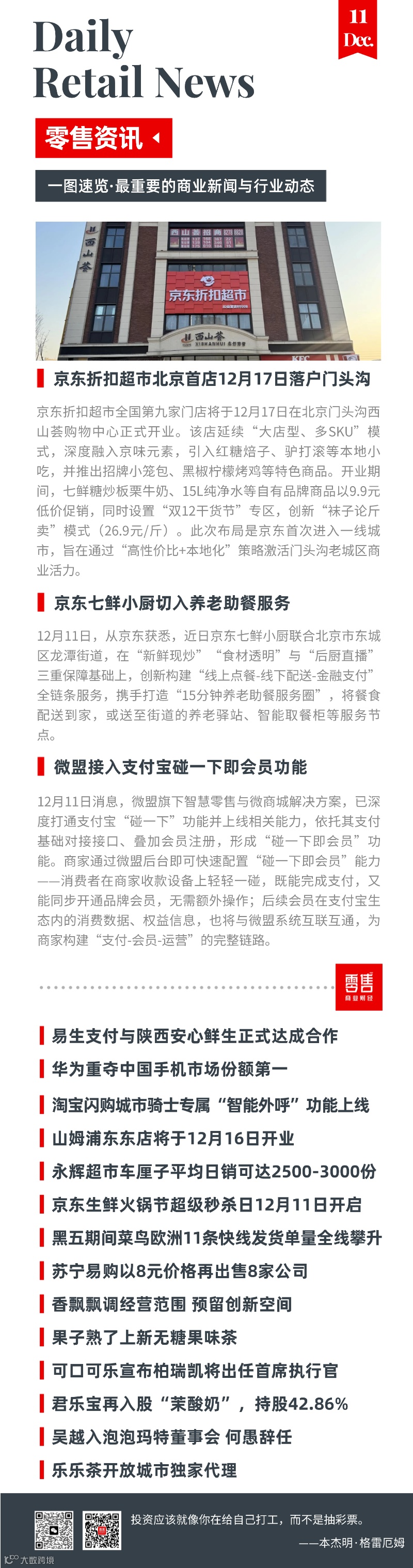 京东折扣超市全国第九家门店将于12月17日在北京市门头沟西山荟购物中心正式开业,为京东首次进入一线城市的重要布局。该店延续“大店型、多SKU”模式,融合京味元素,引入驴打滚、红糖焙子等本地小吃,并推出小笼包、黑椒柠檬烤鸡等特色商品。开业期间,七鲜糖炒板栗牛奶、15L纯净水等自有品牌商品低至9.9元,同步设置“双12干货节”专区,创新推出“袜子论斤卖”(26.9元/斤)促销模式,旨在以高性价比与本地化策略激活老城区商业活力。