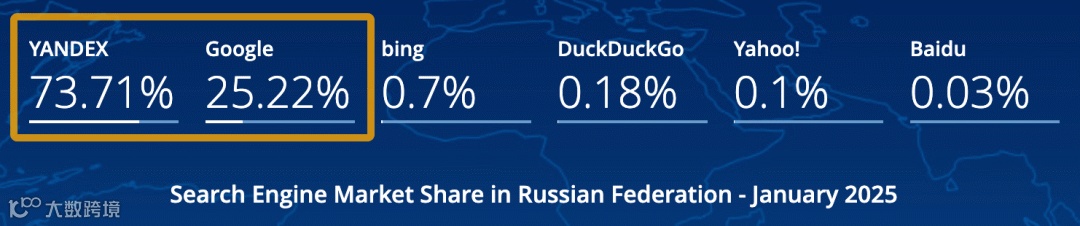 俄罗斯搜索引擎Yandex全球份额为2.73%,但在本土市场占比达73.71%,超越谷歌位列第一,凸显区域化市场的潜力。