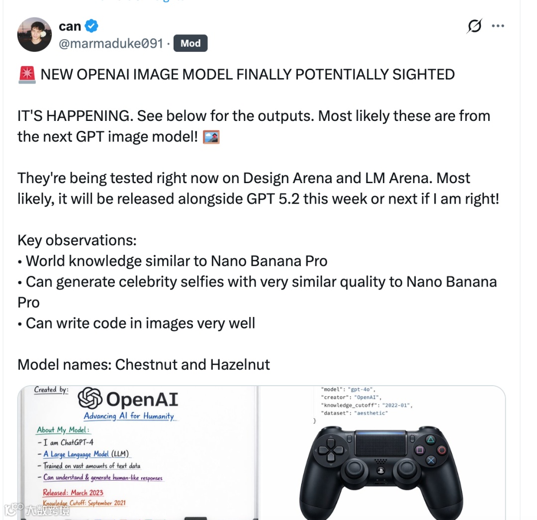 与此同时,X 平台曝出 OpenAI 已在 Design Arena 与 LM Arena 启动新图像生成模型的盲测,模型代号分别为“Chestnut”和“Hazelnut”,表现接近 Nano Banana Pro。据称,新模型具备全球知识理解能力,可生成质量相近的名人自拍照,并支持在图像中编写代码。