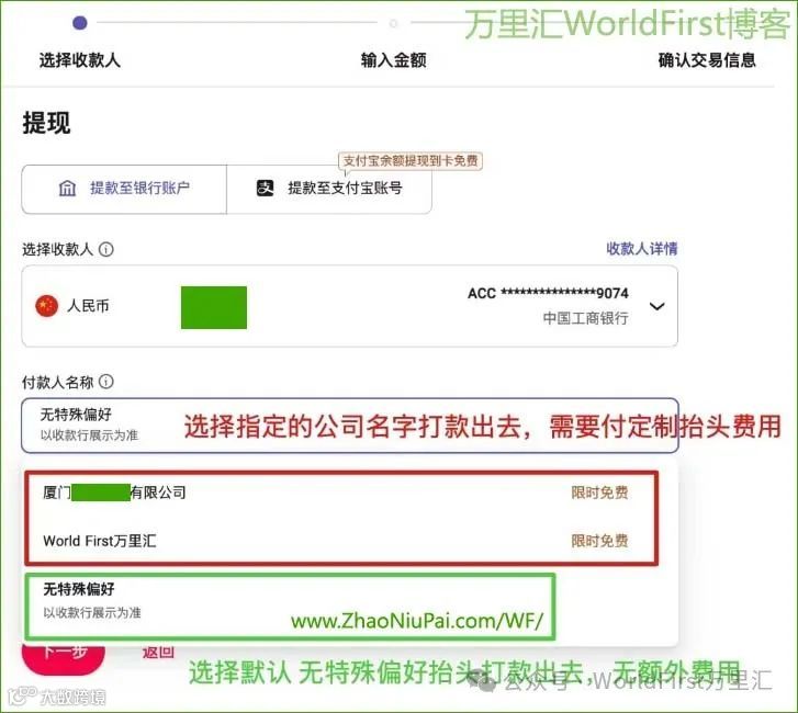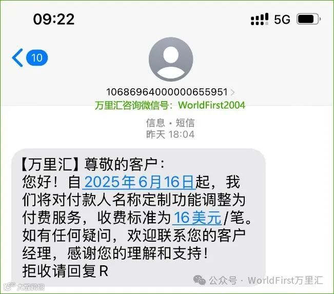 自2025年6月16日起,万里汇WorldFirst将对付款人名称定制功能调整为付费服务,每笔交易收取16美元费用[k]。该功能允许用户在从跨境电商账户提现至国内银行账户时,自定义付款人名称(如公司或个人名称)[k]。