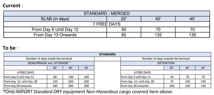 所有港口的免费堆存及用箱时间缩短至4天,自第5天起计收滞期费与滞箱费。