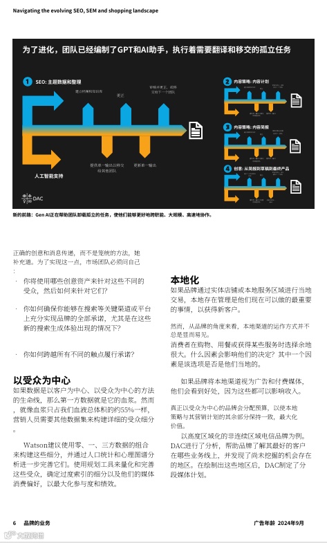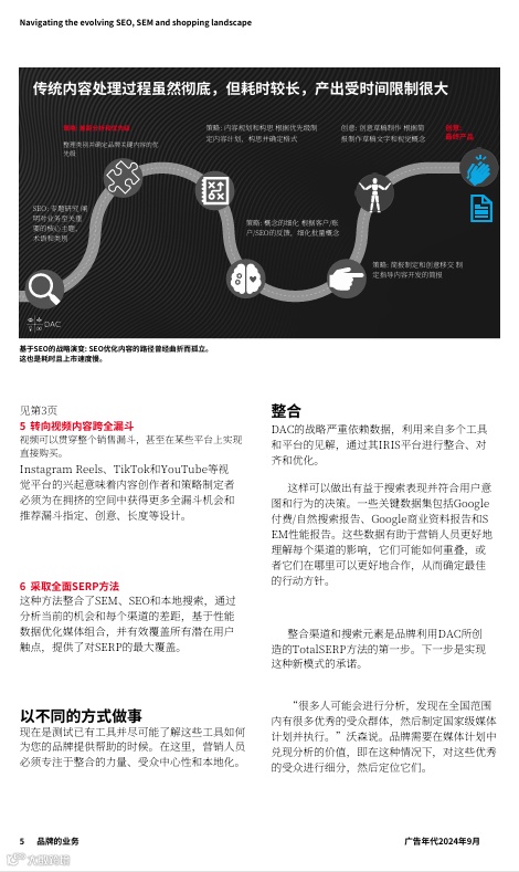 AdAge发布的《2024应对不断变化的SEO SEM和购物格局》,针对行业变化给出了实用应对方向,包括营销团队跨职能合作、调整效果衡量方式、借助AI技术、围绕客户数据做决策、侧重视频内容传播以及整合多渠道的搜索策略。