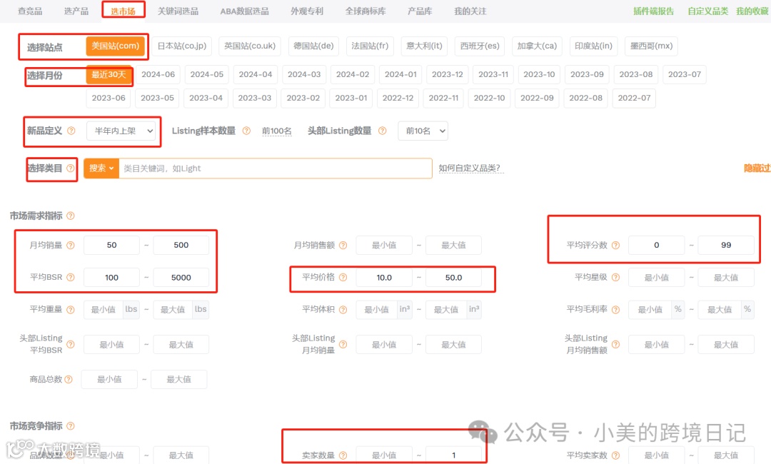 首先,我们打开卖家精灵,产品-”选市场“功能,进入筛选页面。