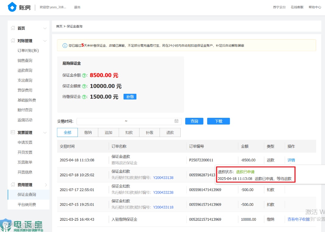 王先生称,其公司于2021年3月在苏宁易购开设店铺,销售自主研发的办公软件,并缴纳了1万元保证金。2021年7月,因有客户下单后始终无法取得联系(软件需先获取客户系统信息方能交付),导致订单发货超时,平台因此扣除了1500元保证金。该公司虽提出申诉但未获支持,为规避后续风险,随后下架了相关产品。2025年3月,该公司正式申请关闭店铺并申请退还剩余保证金。关店申请于4月通过审核,退款申请也于4月18日显示“审核通过”。然而,截至2025年10月,剩余8500元保证金始终未到账。其间,公司多次联系平台类目对接人询问进展,对方均回复“因退款申请过多,正在排队处理”,但始终未能提供确切的退款时间。