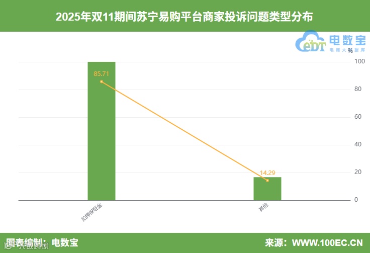据“电诉宝”显示,双11期间苏宁易购平台涉及的商家投诉问题类型主要集中在:扣押保证金(85.71%)、其他(14.29%)。