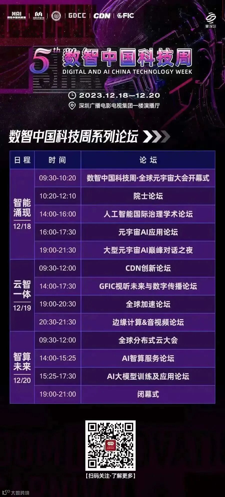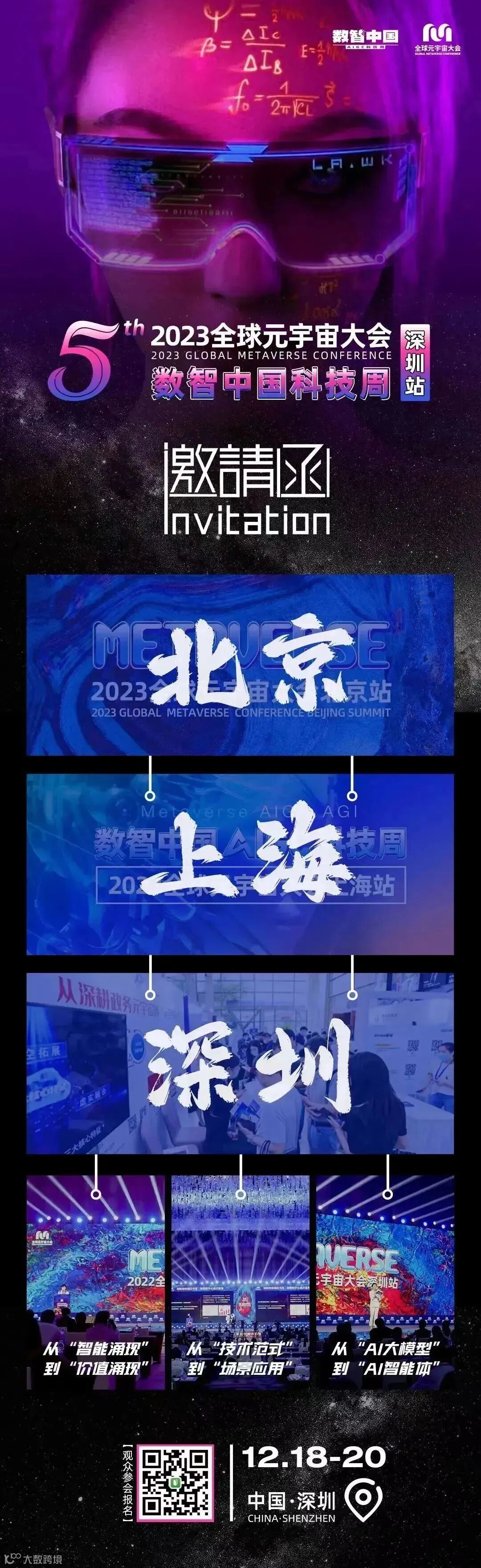 第五届数智中国科技周深圳站将于18号举行开幕式,20日晚举行闭幕式,为全球元宇宙AI产业呈上一份年终巨献,期待在深圳与大家一同记录与见证元宇宙+AI行业的2023。