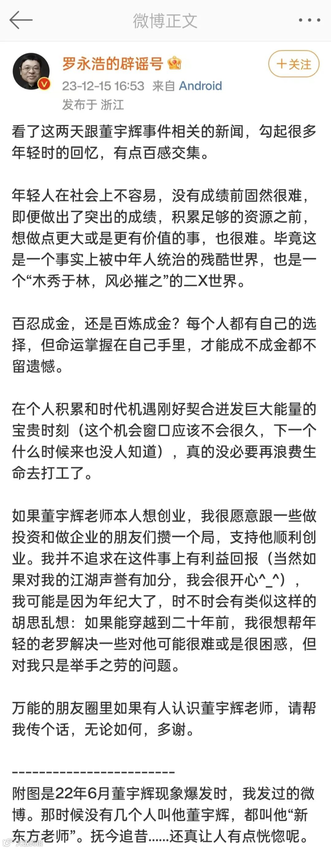 “突然发声是因为不愿意看到董宇辉遭受的这一切,希望做点力所能及的事,毕竟说起来也是遭遇有些类似的同门师兄嘛。”这是罗永浩最开始介入东方甄选事件时的说法。