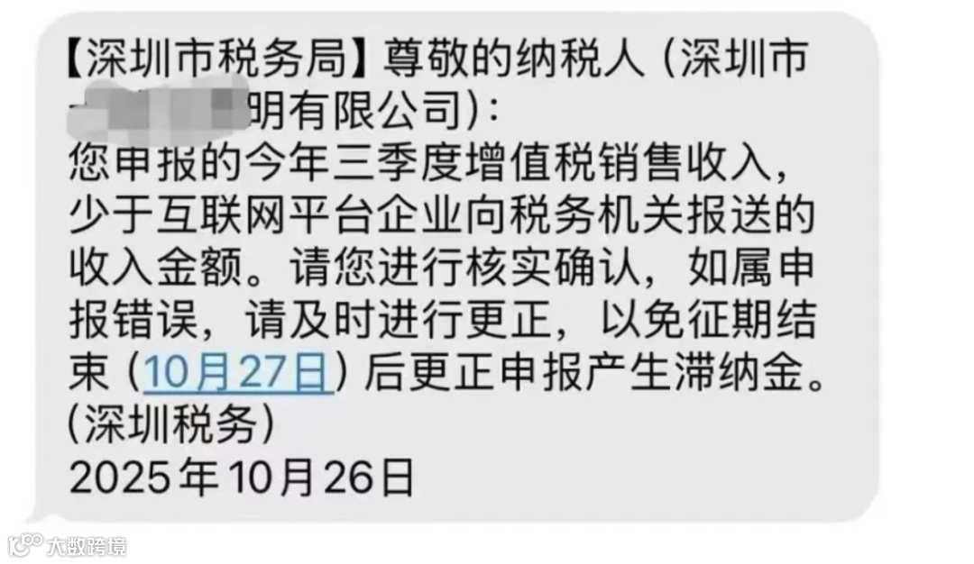随着税法新政落地,亚马逊等跨境电商平台陆续向税务部门同步经营者收入数据,大量卖家开始收到税务局短信,提醒其第三季度申报的增值税销售额明显低于平台报送金额,并要求尽快核实更正。