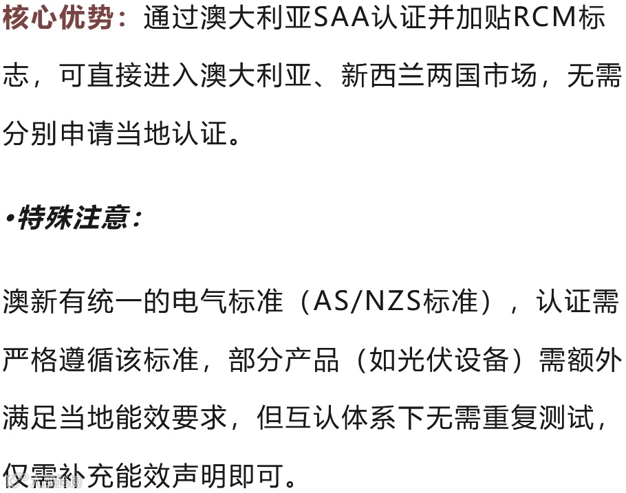 澳大利亚SAA认证(安全认证核心)与新西兰RCM( Regulatory Compliance Mark)标志达成全面互认,核心覆盖电气安全、电磁兼容(EMC)、无线通信等要求,适配家电、照明设备、IT产品、电动工具等带电品类。