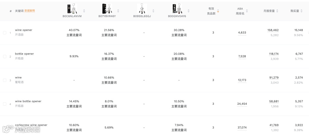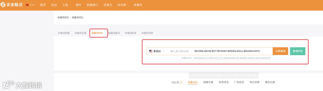 在输出五点描述之前需要整理一下产品的关键词词库,可以将步骤1下载的asin表中的asin列表复制到卖家精灵的关键词优化 - 流量词对比中