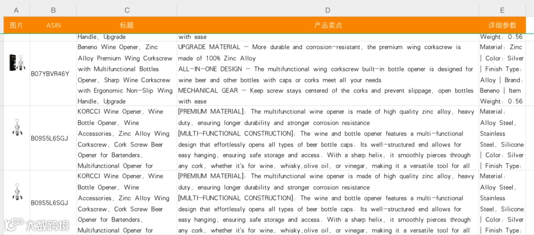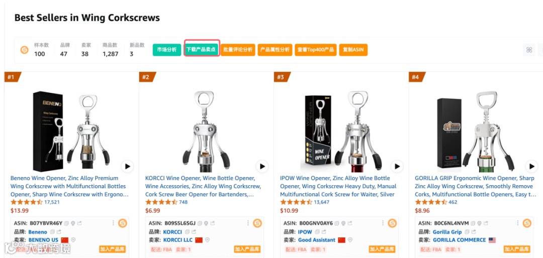 1.打开Wing Corkscrews的榜单,使用卖家精灵查询,点击下载产品卖点