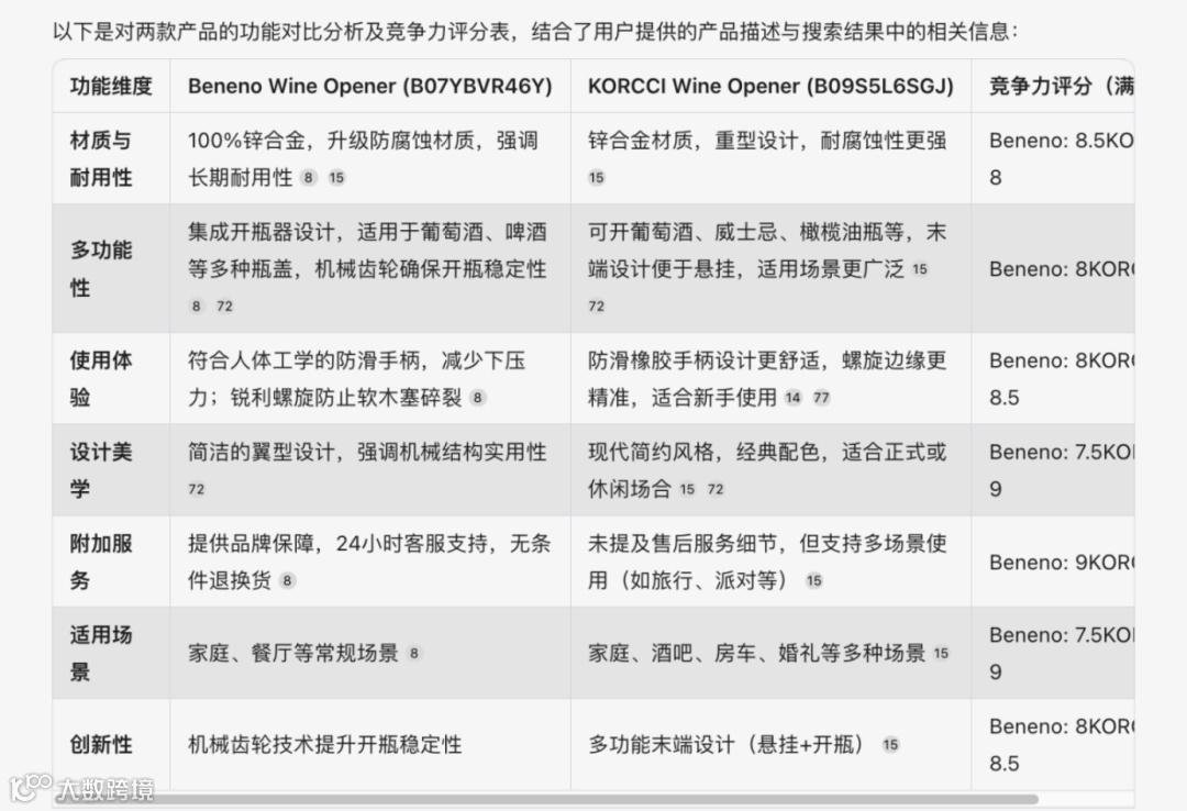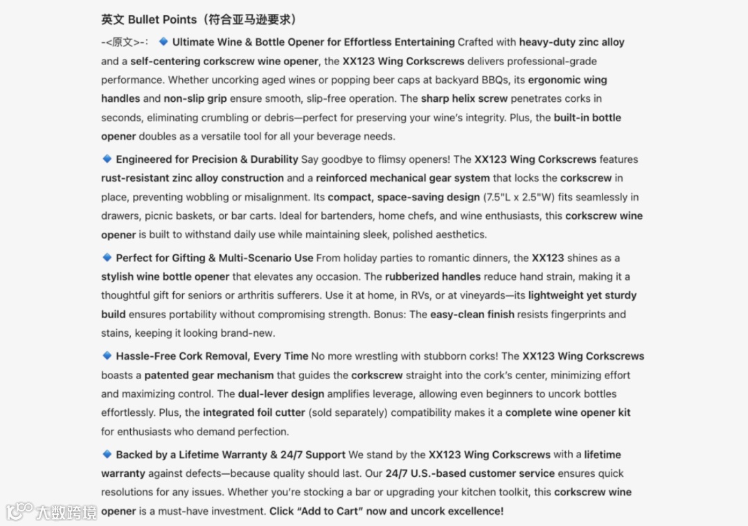 本文通过酒瓶开瓶器的实操案例,系统展示了如何利用DeepSeek完成从竞品分析到文案优化的全链路升级。首先,通过AI的竞品功能对比与竞争力评分,卖家能够清晰识别自身产品的核心优势与潜在短板,从而针对性优化卖点。其次,AI生成的高质量文案不仅符合亚马逊平台的算法规则,还通过本土化语言与情感化表达,将冷冰冰的参数转化为消费者可感知的价值。觉得不错的话,自己也去试试哦。