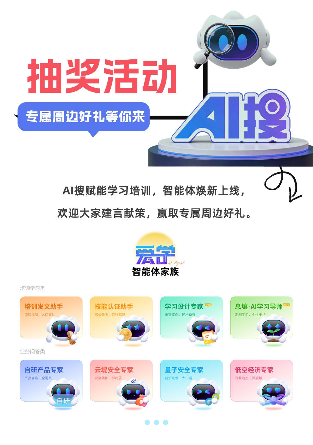 AI搜将持续推出各类智能体来满足大家的不同需求,现在我们特别需要你的真实体验反馈!不管是觉得“学习设计师”的方案生成还不够精准,还是希望“量子智能体”增加产品详细参数介绍,或是对“AI搜”平台整体使用有任何建议,都可以通过以下两种方式进行反馈: