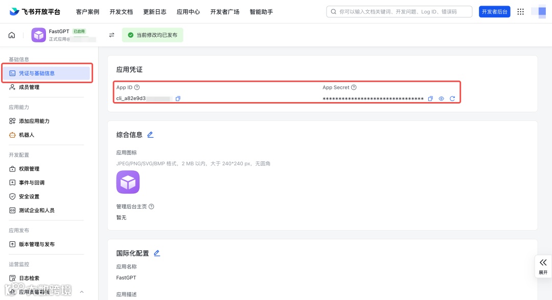 连接 FastGPT 与飞书在 FastGPT 应用「发布渠道」→「飞书机器人」中新建链接,填入凭证。