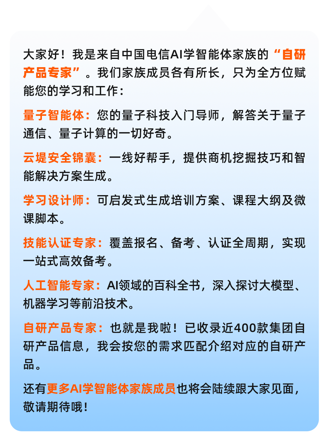 入口:登录中国电信智慧学习平台→进入“AI搜”→ 输入@后选择“自研产品智能体”即可使用!