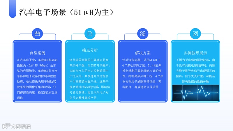 例如:在汽车电子中的CAN FD 5Mbps高速通信中,51μH的共模电感能很好地应对高频尖峰干扰