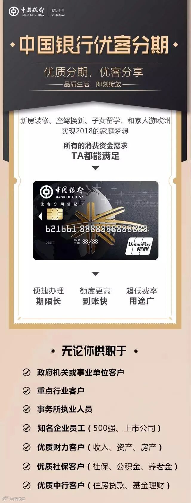 中国银行优客分期是为优质客户提供消费资金需求的信用卡分期业务,根据客户资信授予额度,分期还款并收取手续费。