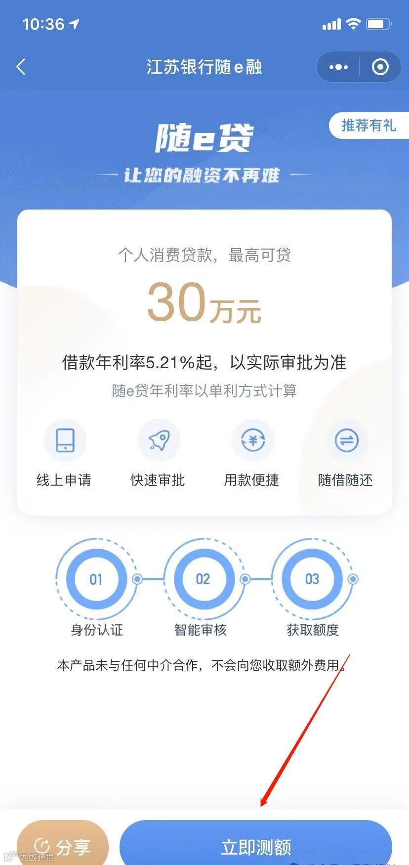打开江苏银行手机银行APP或微信小程序“苏银随心办”,搜索“随e贷”产品入口。 -